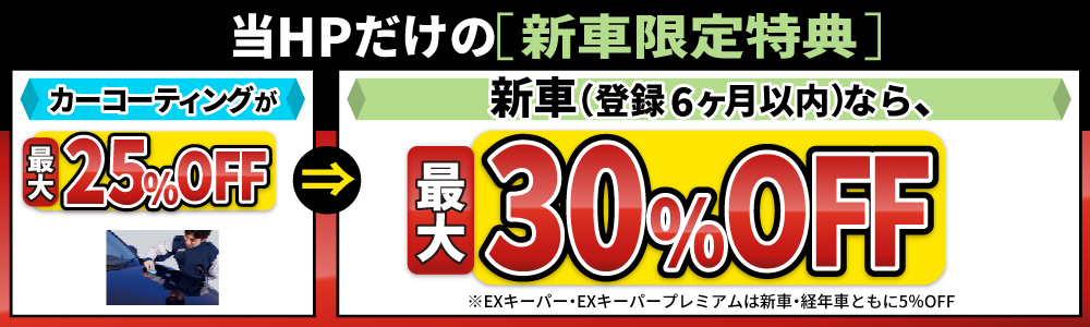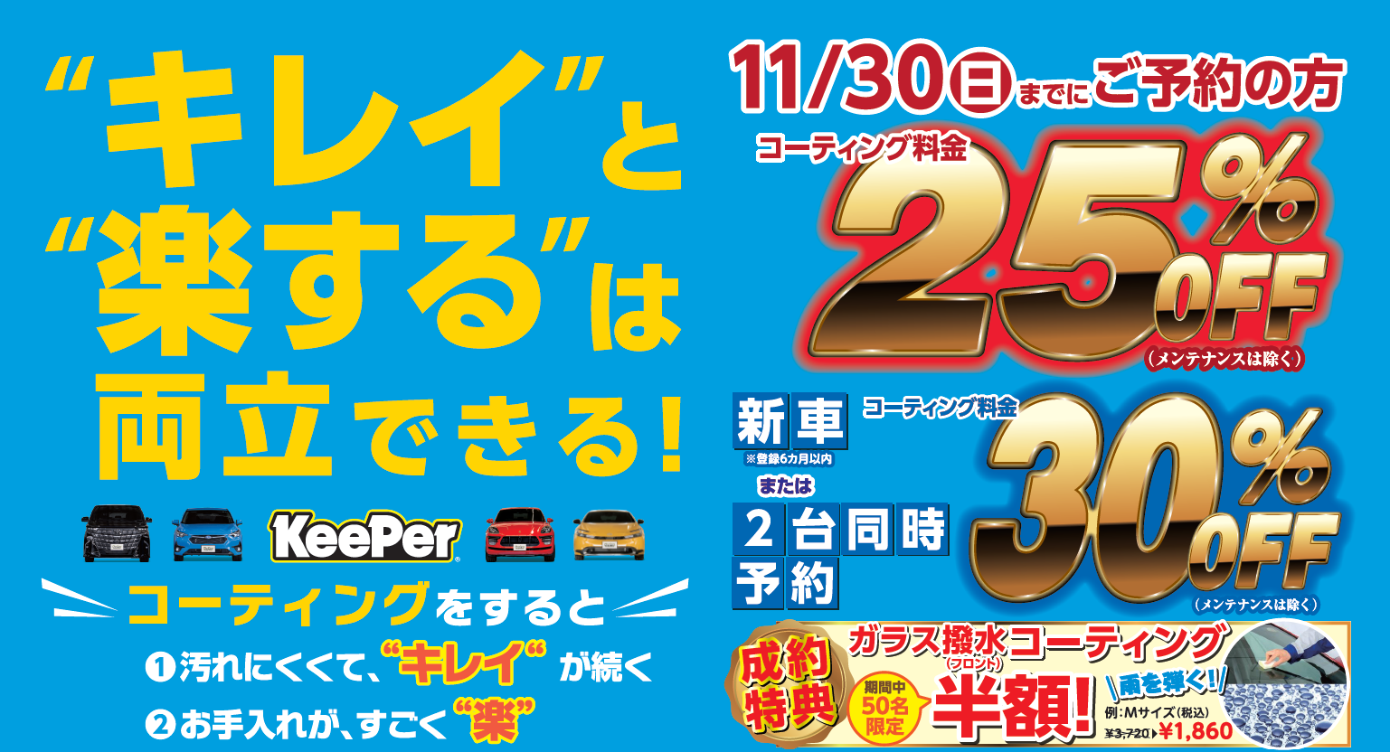 当HPをご覧になり、お電話・メールでご予約頂いたお客様限定で、コーティングの施工料金最大25%割引を実施中!また、他社にはないお得な特典もお客様にご提供しております。キーパーコーティングをお考えのお客様は、是非、当店にお任せください!