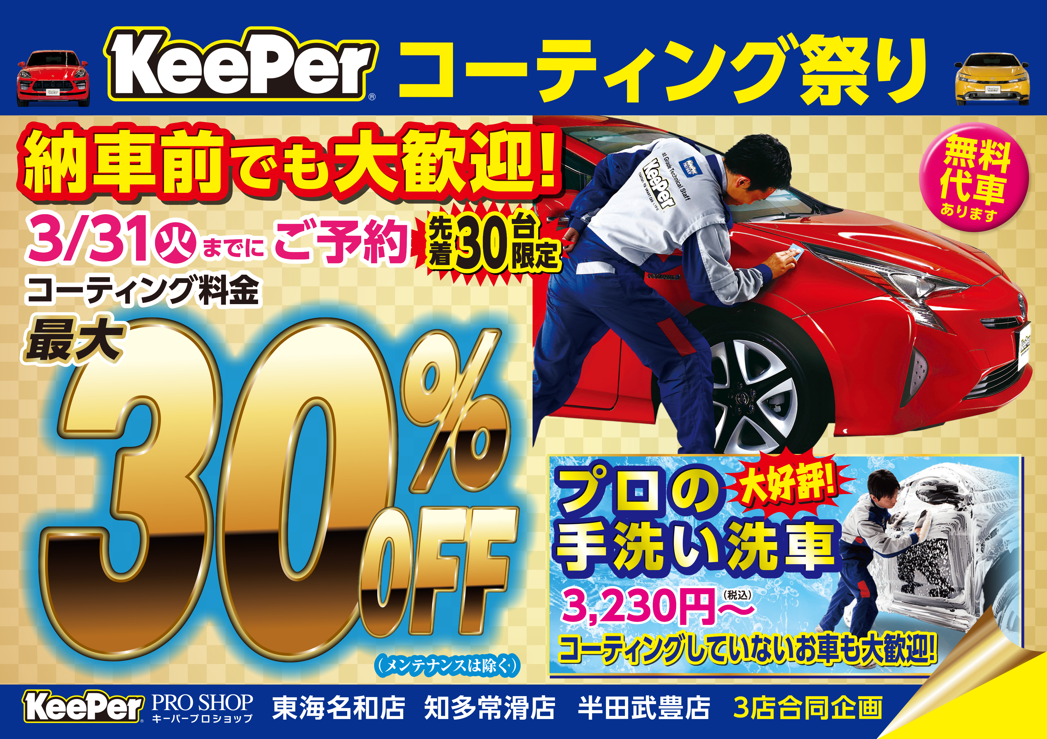 そういった半田市・常滑市・武豊町・美浜町・高浜市・碧南市・南知多町エリアのお客様の声にお応えして、当店でコーティングを実施頂いたお客様には、無料代車レンタルを始めました!